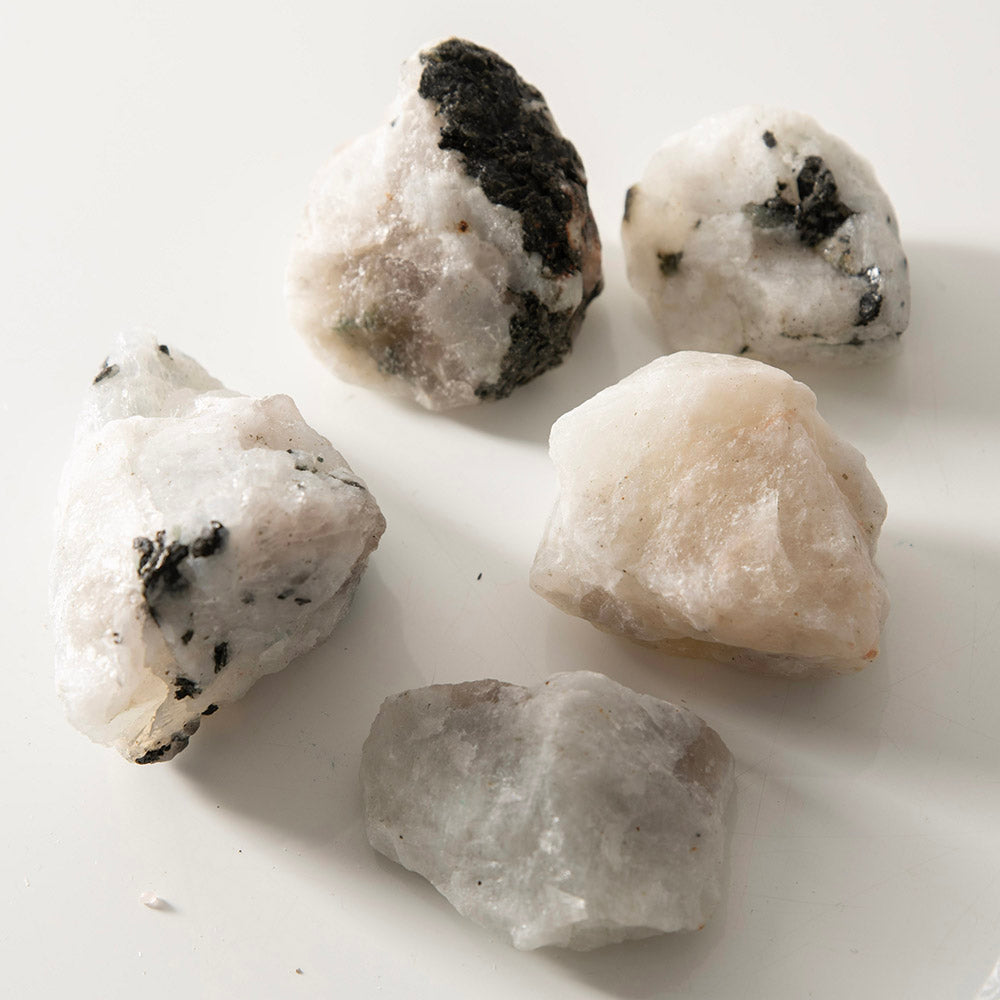 The formation of Rainbow Moonstone occurs within the layers of feldspar minerals, primarily orthoclase and albite. As light interacts with the intricate microstructure within the stone, it refracts and scatters, giving rise to a captivating display of colors—blues, purples, pinks, and sometimes even golden tones—reminiscent of a radiant rainbow glowing beneath its surface.
