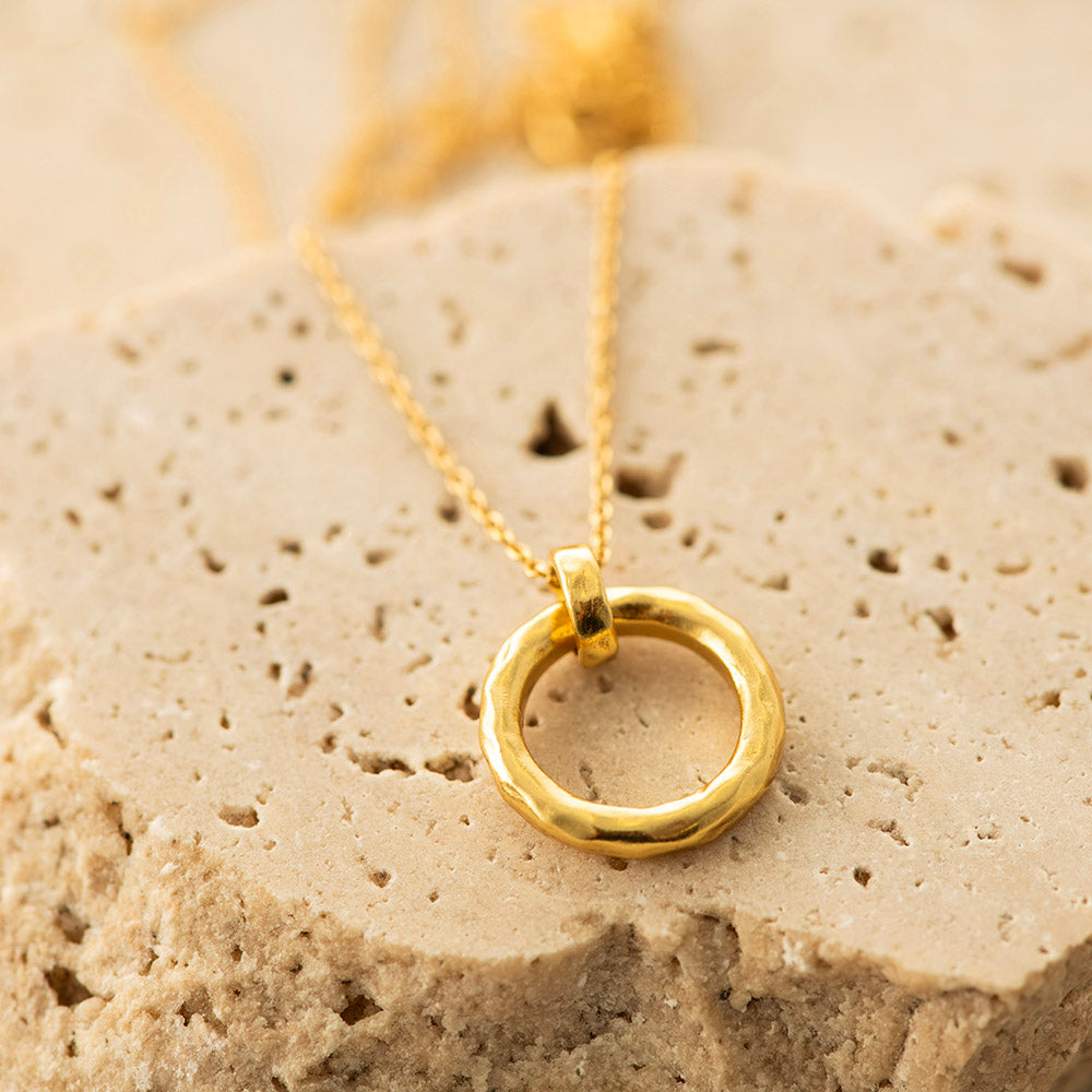 This gold-plated hammered charm necklace features a delicately textured disc that gently catches the light, symbolizing subtle energy and calmness. Its understated shimmer invites a sense of peaceful presence, making it a meaningful piece to enhance your daily wear with soft, spiritual radiance.